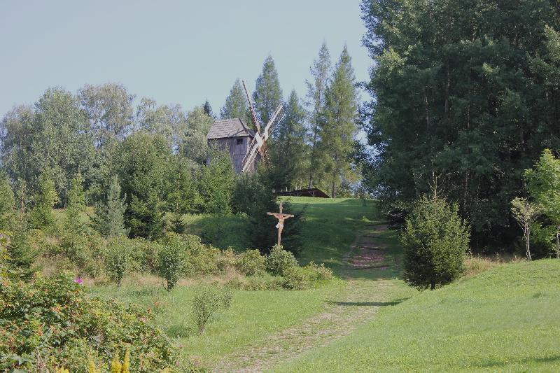 V popředí je zájezdni hostinec z Szalejowa Dolného a na kopci stojí větrný mlán z Jablówa