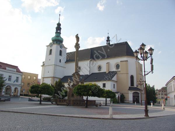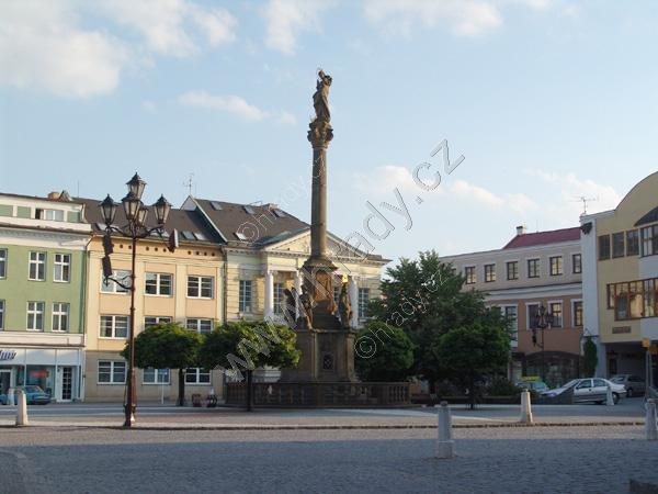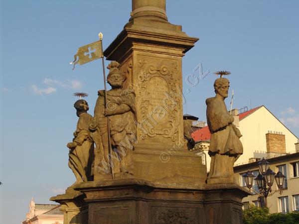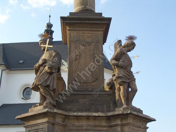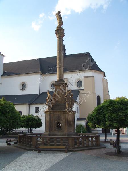 Pohled na sloup v pozadí s kostelem Navštívení Panny Marie