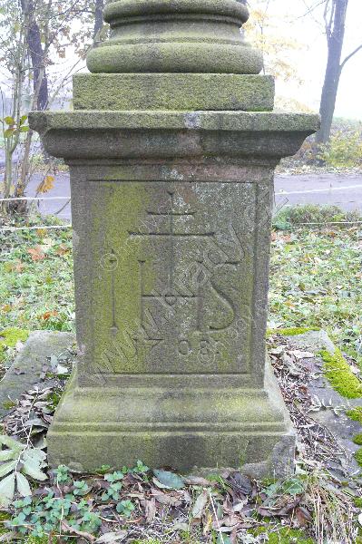 letopočet, monogram IHS a kříž na podstavci sloupu