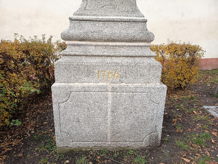Socha od jihovýchodu, v pozadí brána děkanství