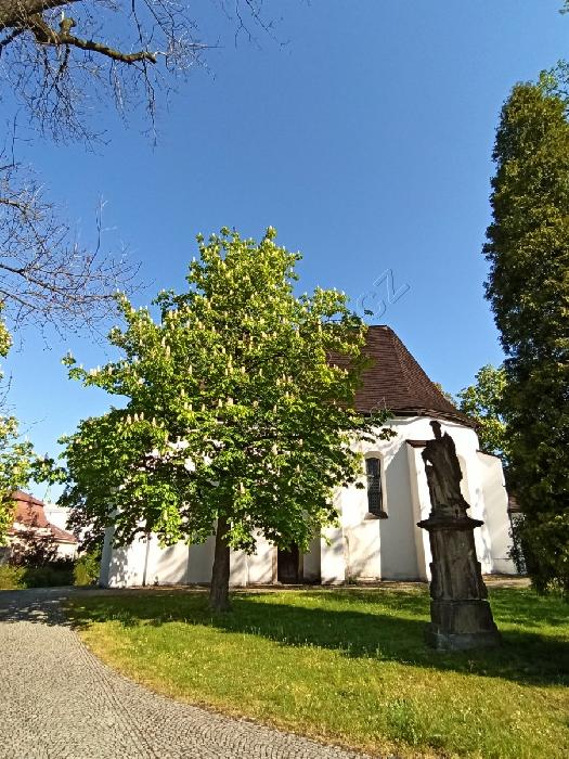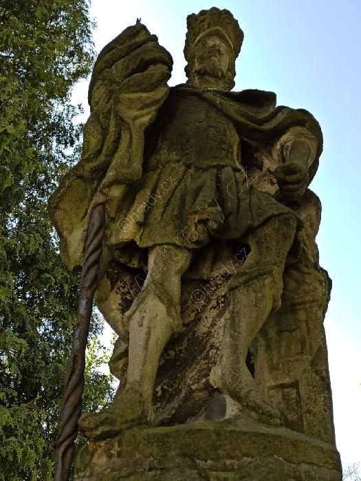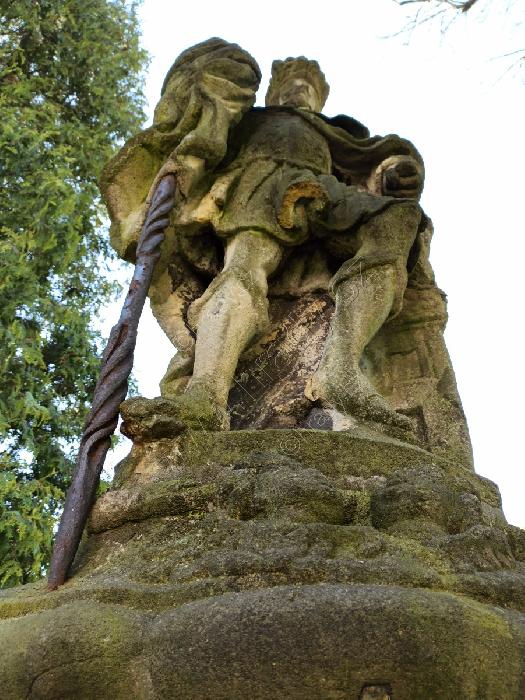 Fotografie dokládá jednak špatný stavební stav renesančního kostela už v 60. letech 20. století, tak hlavně, že ještě v této době měla socha jak všechny kovové atributy, tak i sošku andílka u nohou.