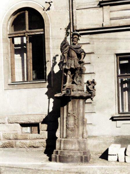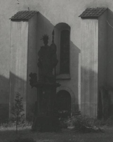 Detail fotografie z roku 1963, která dokládá přítomnost sochy sv. Floriána u kostela sv. Jošta