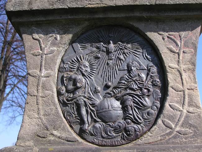 Litinová deska s církevním výjevem zasazená v podstavci sochy