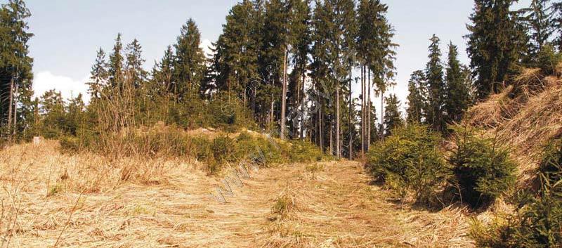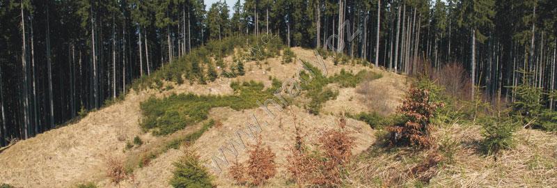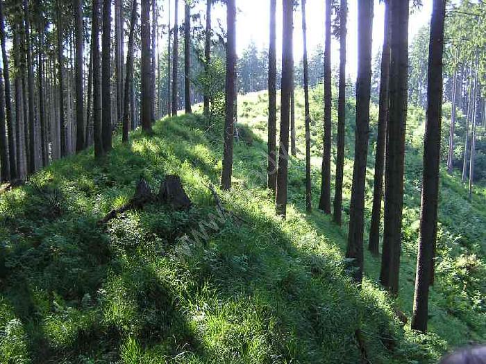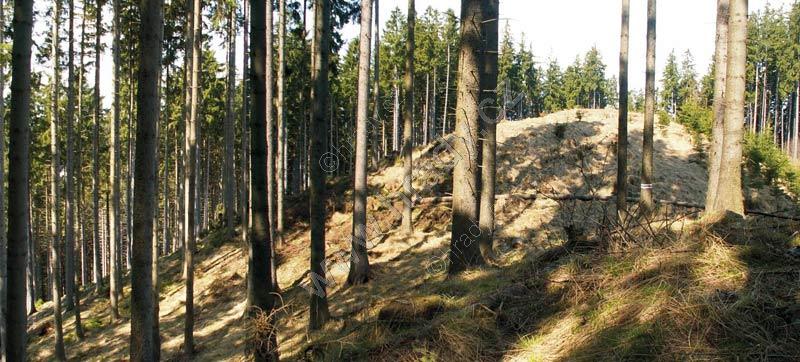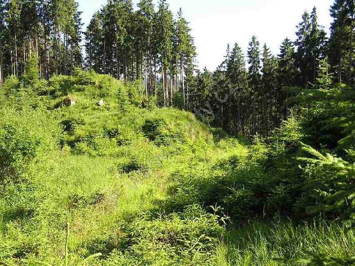 Detail rozdílu mezi sníženým místem připomínající příkop a prudce se zvedající stranou mohutné části lokality
