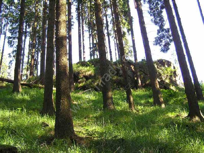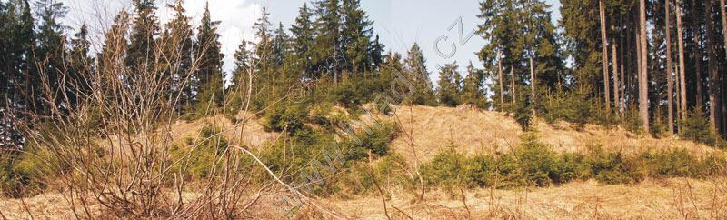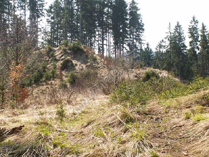 Pohled z mohutnější části lokality přes příkop na méně výraznou část ukončenou na severozápadě skaliskem