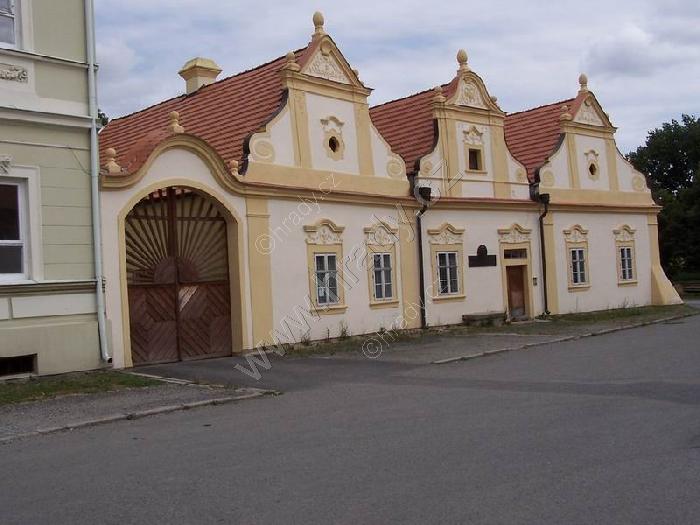 Pohled směrem od řeky (Radbuza). Boční od země zesílená zeď chrání budovu proti velké vodě, což se v praxi zatím naposledy osvědčilo při rozsáhlých povodních v r. 2002.