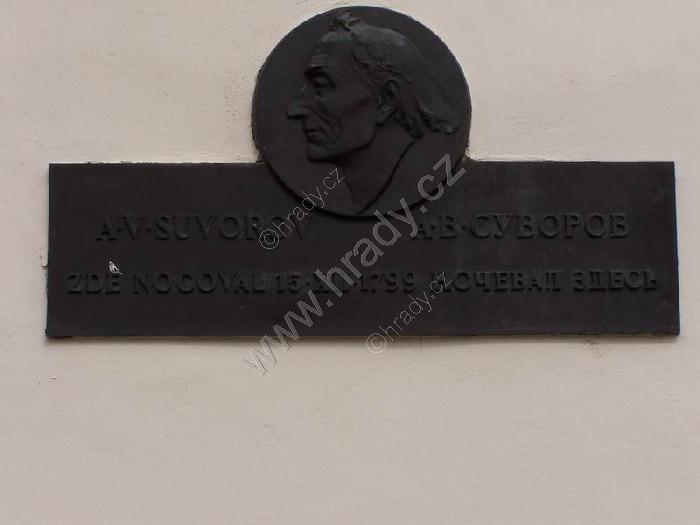 pamětní deska připomínající ruského vojevůdce A. V. Suvorova, který v budově přenocoval v prosinci 1799