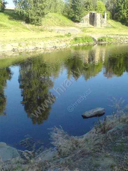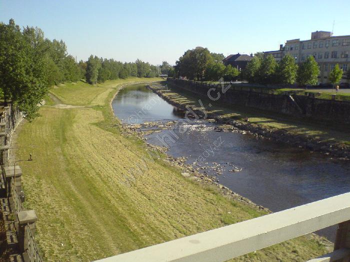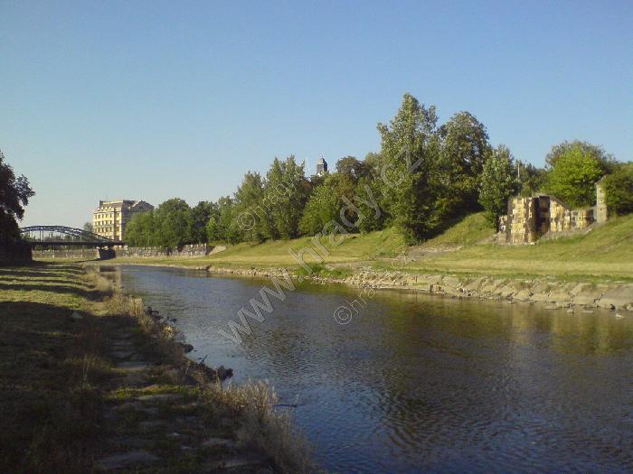 Sýkorův most, věž radnice Slezské Ostravy a řeka Ostravice