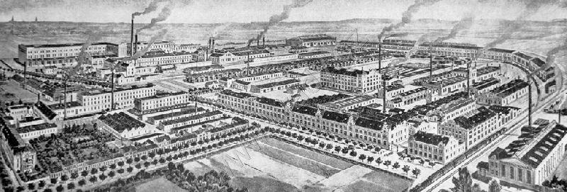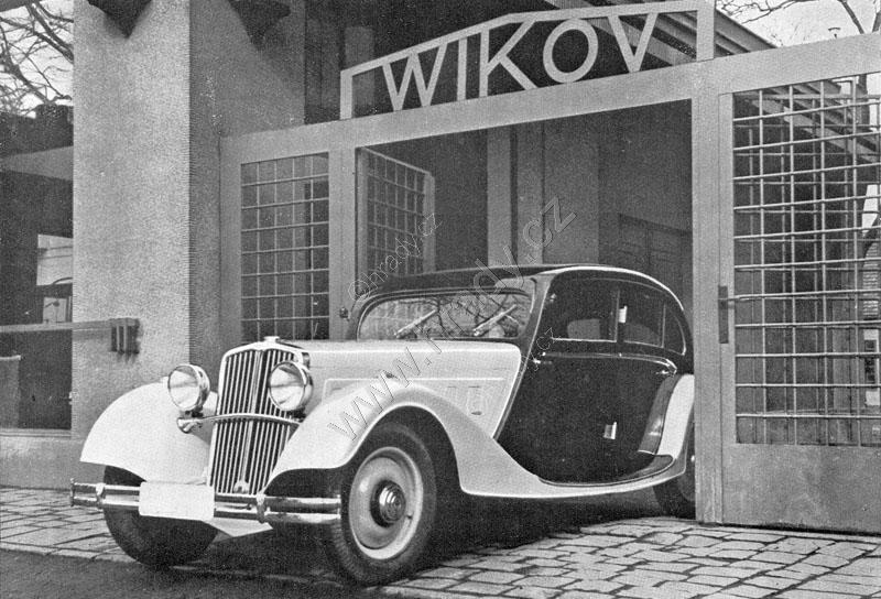Veduta podniku Wikov Prostějov z třicátých let 20.stol. - automobilka zaujímá místo vlevo dole, úplně v rohu vila rodiny Wichterlových. Uprostřed vedutyvede Vrahovická ulice.