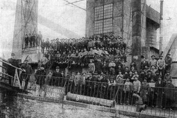 Dělníci a slévači železáren v bašce na společné fotografii z roku 1908