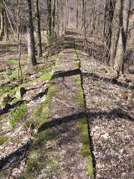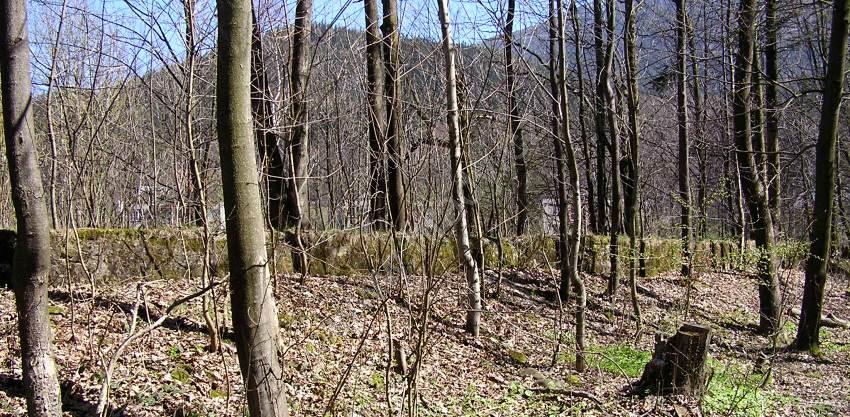 Pohled na dlouhý betonový základ ohrazení či jedné z budovy zaniklých železáren