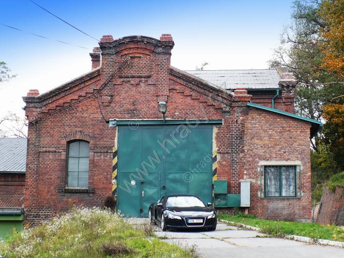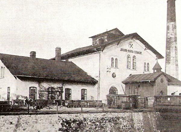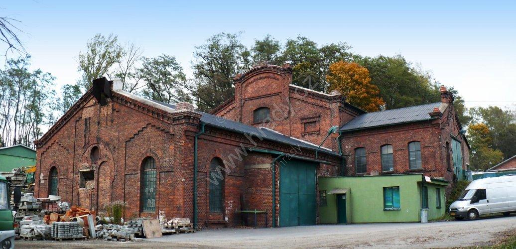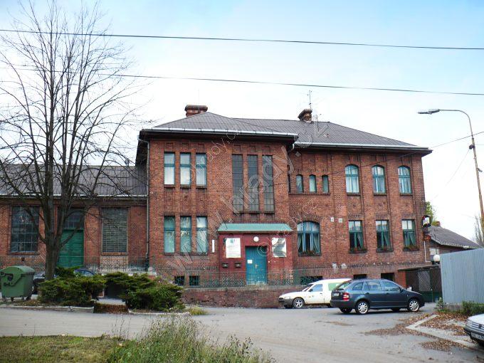 pohled od příjezdu do areálu na budovu bývalých kanceláří dolu