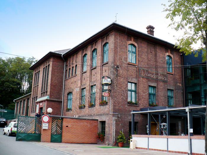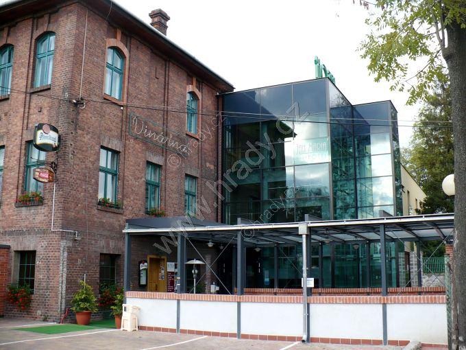 přístavba moderního hotelu k bývalé budově dolu z režného zdiva