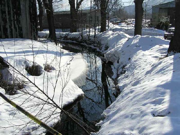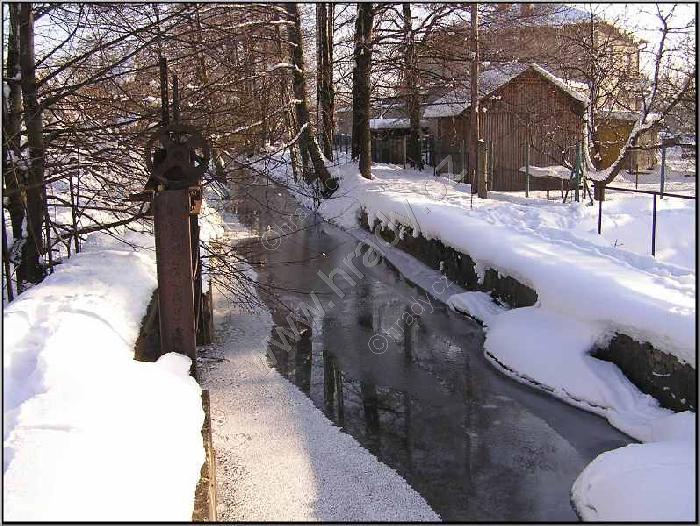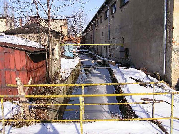 Snímek zobrazuje technický náhon, jež vybočoval z řeky Ostravice v místní části Nová Dědina, procházel železárnami, centrem města, které odděloval od místní části Kamenec, protékal pobočným závodem slévárny III (později Rádlo)v místní části Kuty a nad Pržeňským splavem se vléval opět do řeky Ostravice.