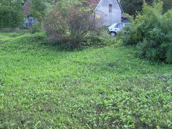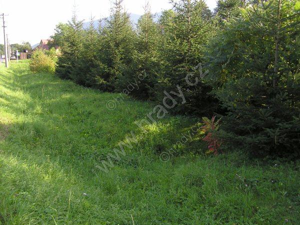 Zatravněná a mladými stromky osazená hromada suti bo objektu bývalého Hamru č. II