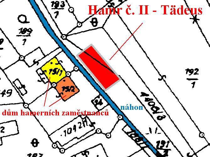 vyznačení objektu hamru č. II na mapě Stabilního katatsru ze 30. let 19. století