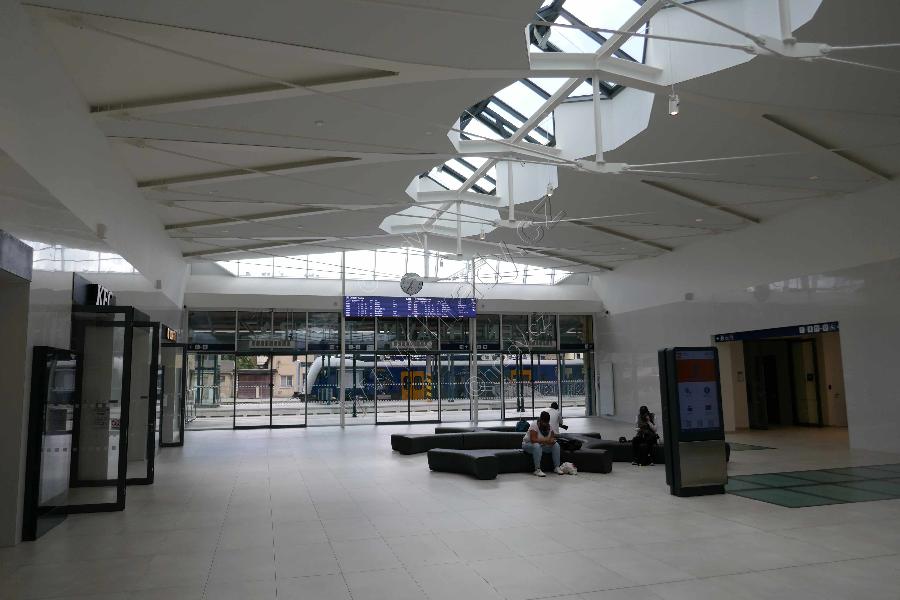 Zadní horní hala staniční budovy s postmoderní ocelovou konstrukcí střechy.