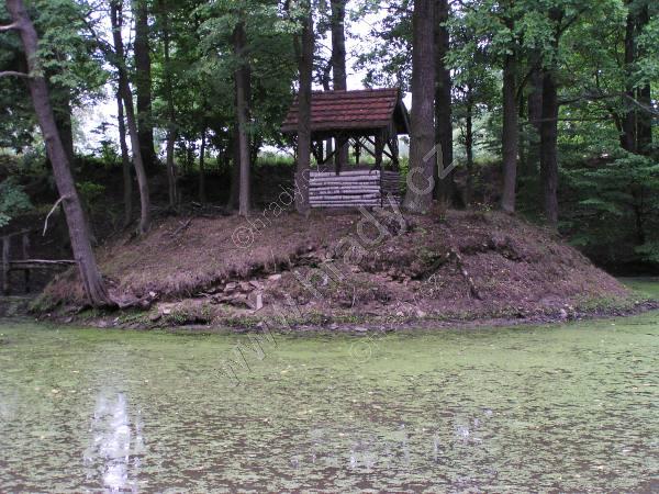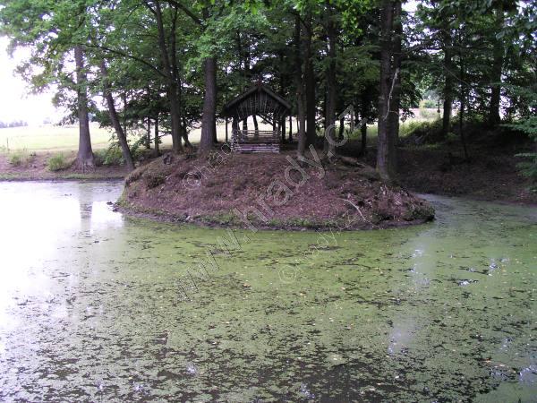 Celkový pohled na tvrziště uprostřed rybníka od jihu