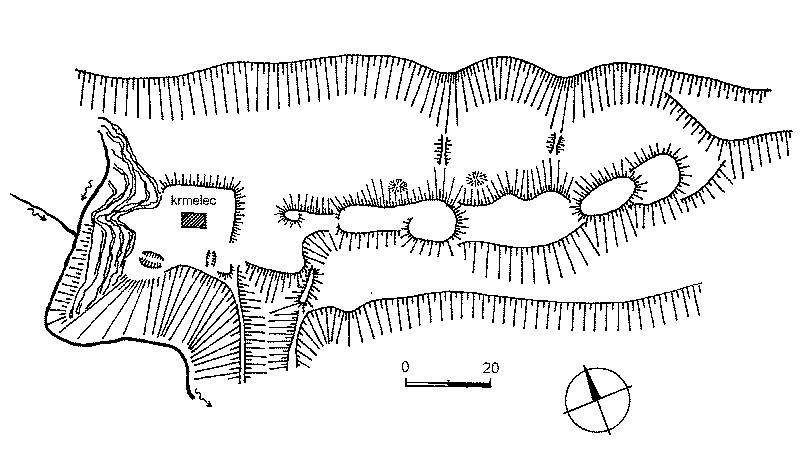 znatelná terénní hrana na východě a severu lokality, uprostřed plata krmelec