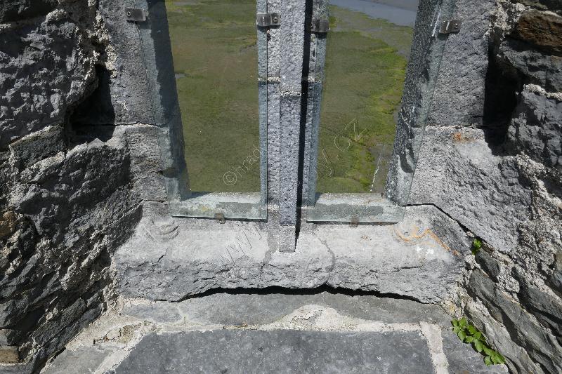 Okno ve velkém sále v nejvyšším patře domu. Pod oknem je škvíra k odtoku kapalného odpadu.