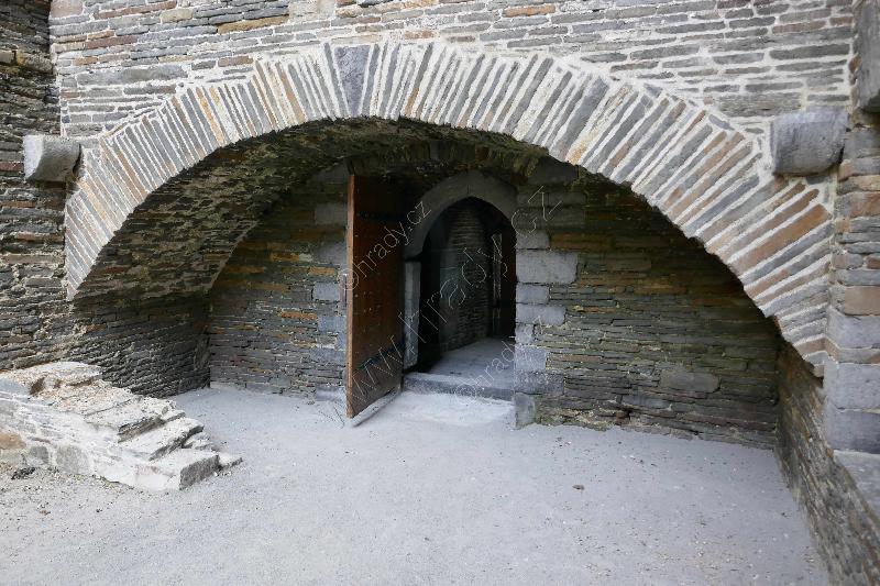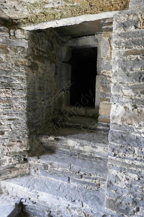 Vstup do skrýše (trezoru) ve třetím patře mezi klenbou a vnější zdí věžového domu.