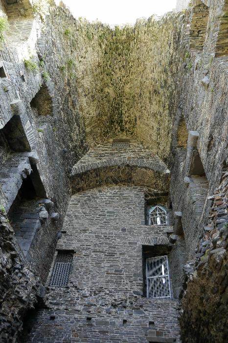 Pohled z tvrze dolů na vnější parkánovou hradbu.