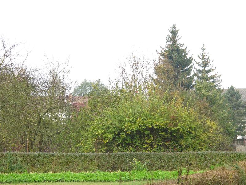 Zarostlé místo starší tvrze, vzadu za živým plotem místo mladší tvrze