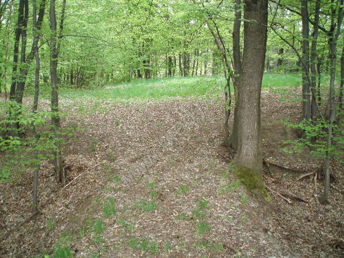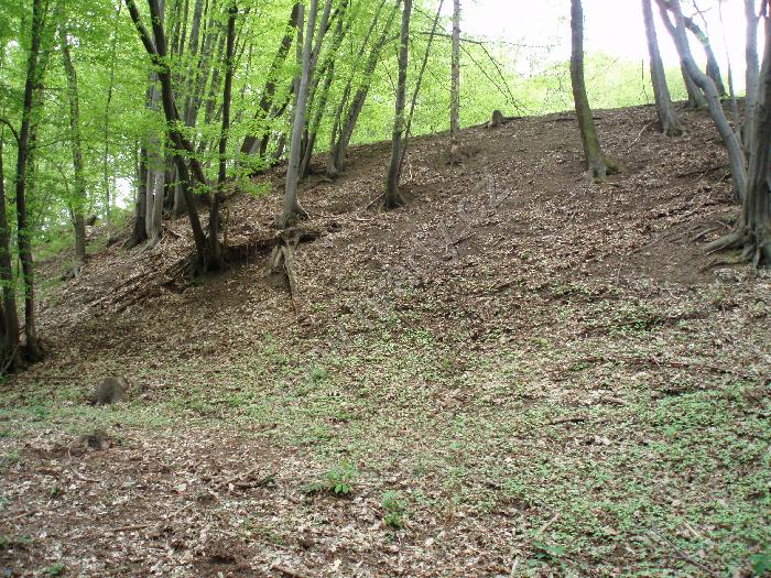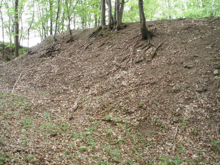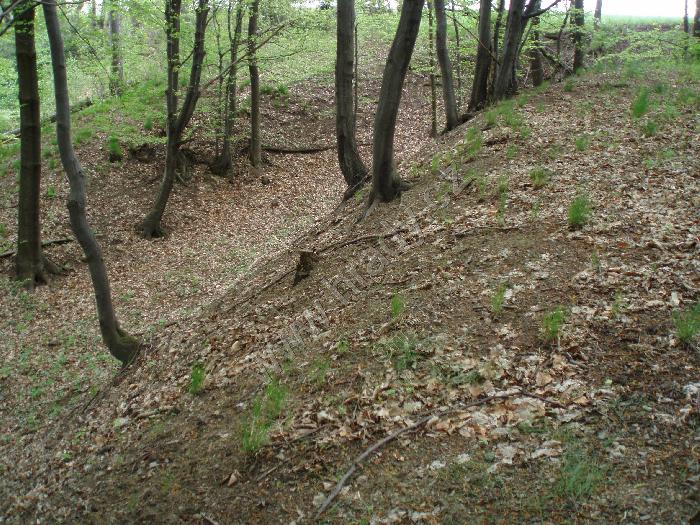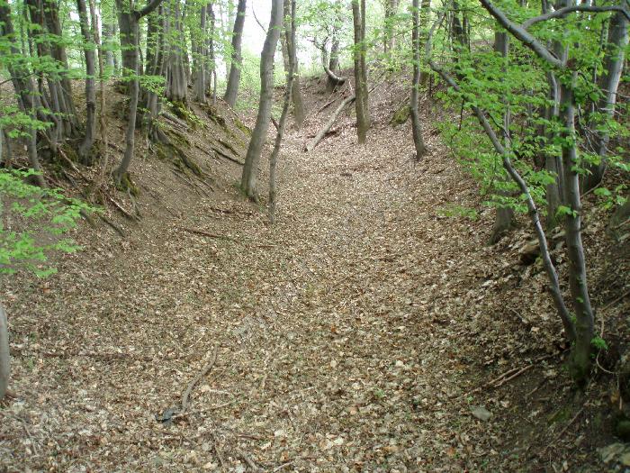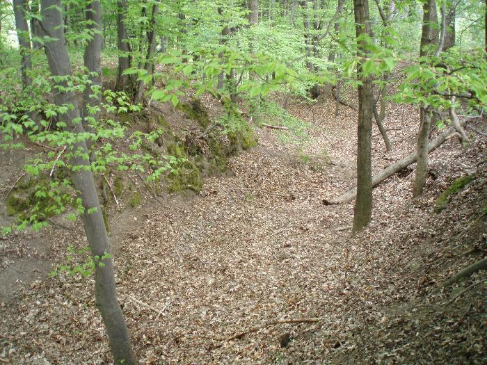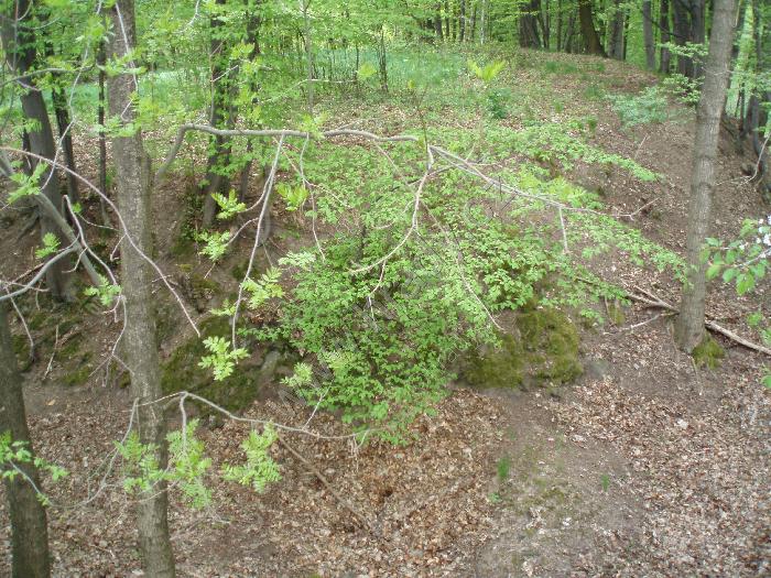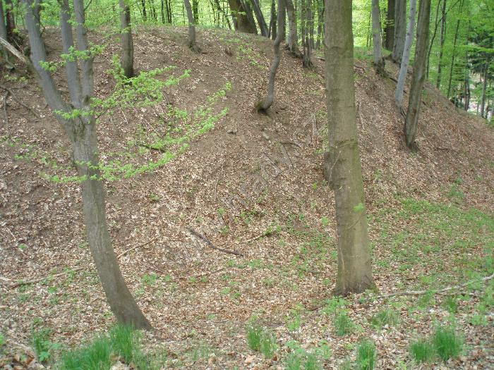 Pohled na tvrziště od východu přes příkop vytesaný ve skále.