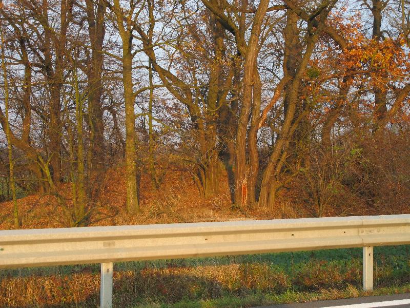 Pohled na pahorek bývalé tvrze z tělesa silnice Valašské Meziříčí - Hustopeče