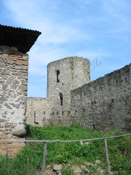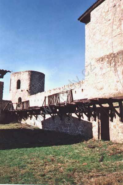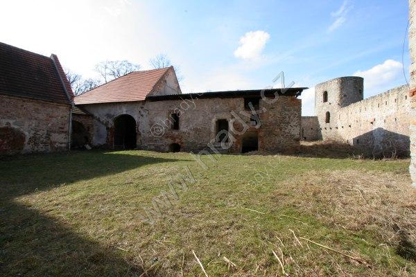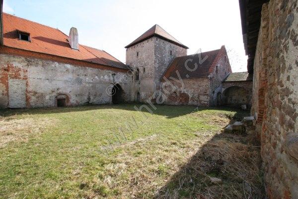Nádvoří tvrze s okrouhlou obranou věží (vpravo) a tzv. purkrabstvím (uprostřed)
