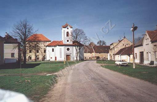 Na fotografii je vidět náves v Kestřanech. Za kostelíkem se nachází budova bývalého zámku a hospodářské budavy. Za nimi se rozkládají obě tvrze.