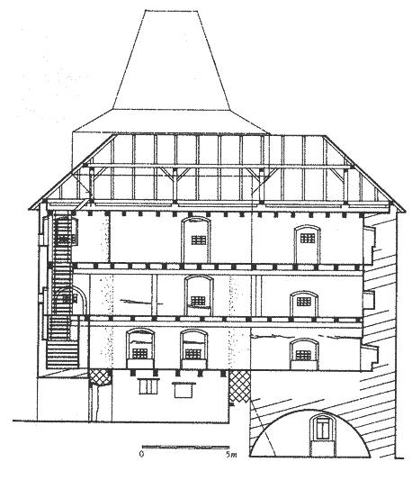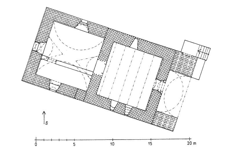 Kratice, plán přízemí tvrze. Šikmými křížka značeno gotické zdivo, kolmými křížky renesanční zdivo, přetrhávaně pak zdivo hypoteticky renesnační. Kresba Jiřího Úlovce podle zaměření Vladimíra Švábka.