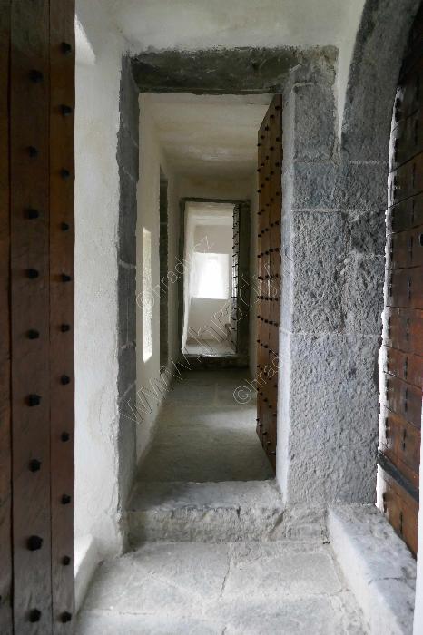 Chodba ve druhém patře, pohled k východu. Napravo je vstup z velkého sálu.