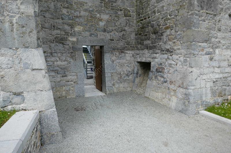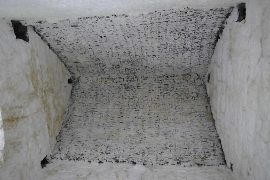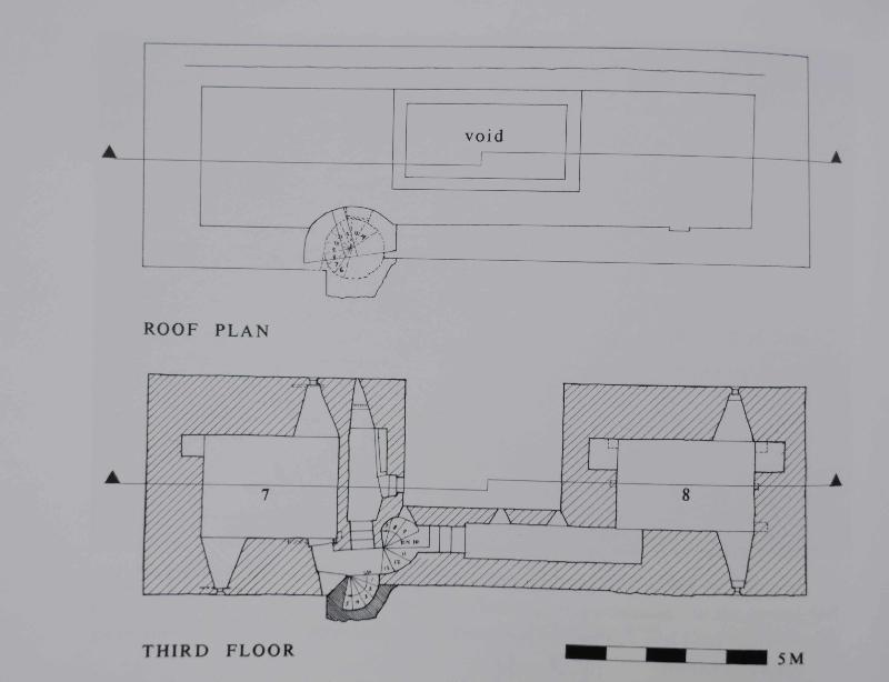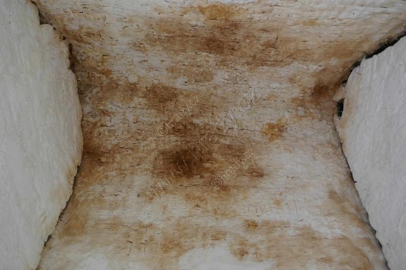 Vyústění odpadové šachty latrín v prvním a třetím patře je těsně nad zemí poblíž nově proraženého portálu ve spojovací zdi.