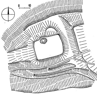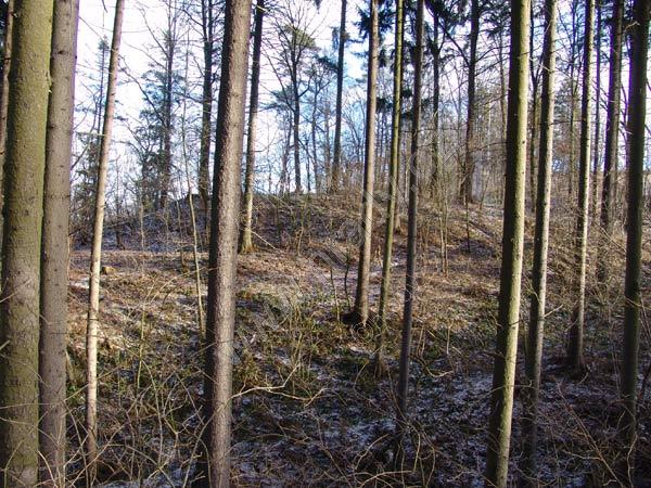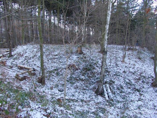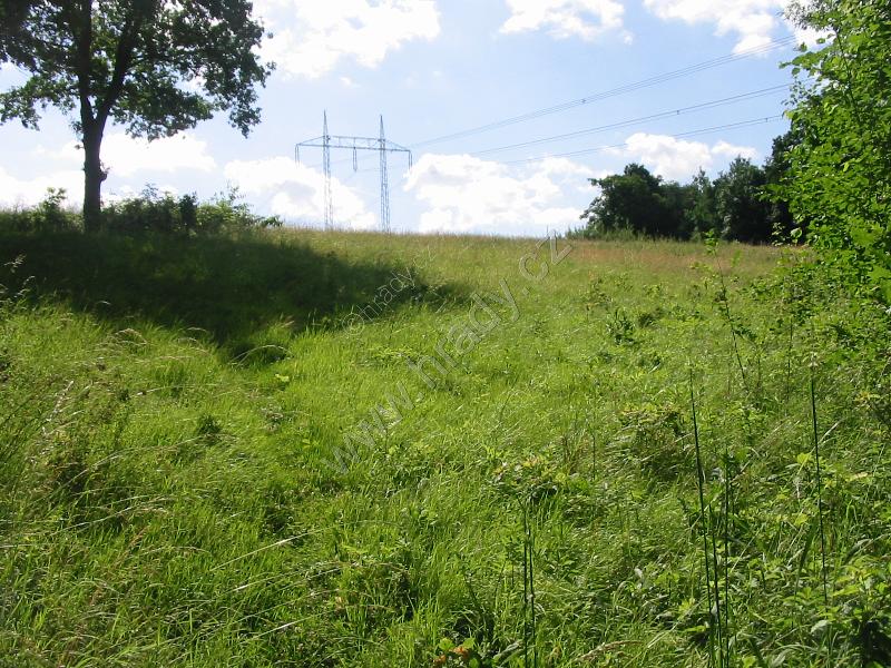 Pohled na tvrziště od jihovýchodu, vpravo čelní příkop