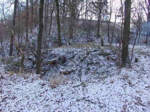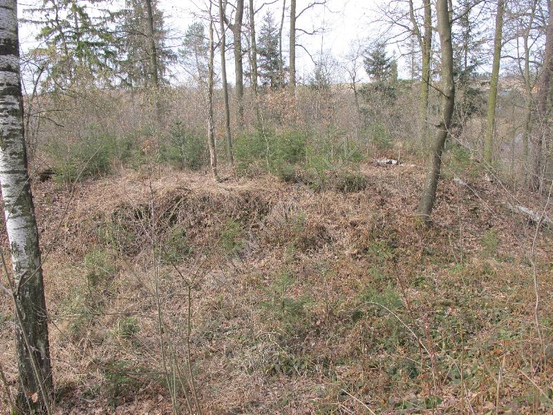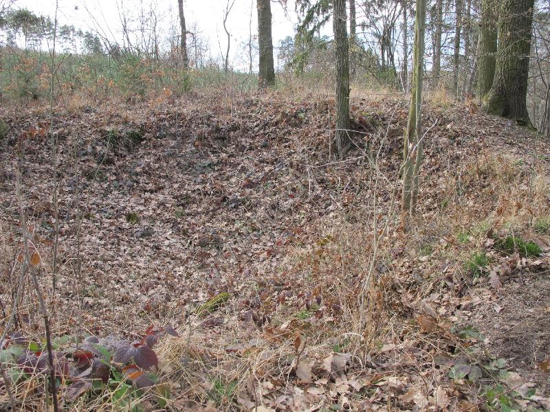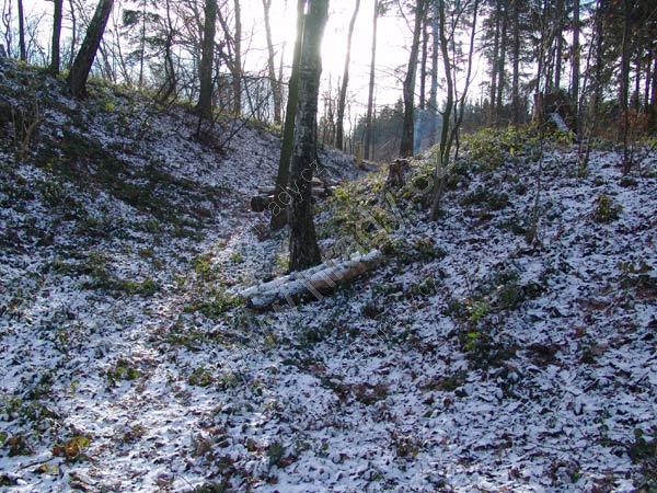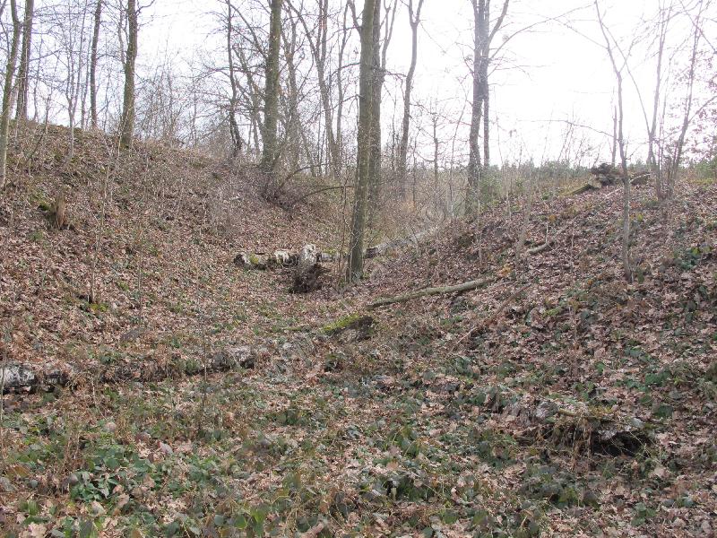 pohled na čelní východní příkop od jihu, jádro je vlevo,vpravo čelní val