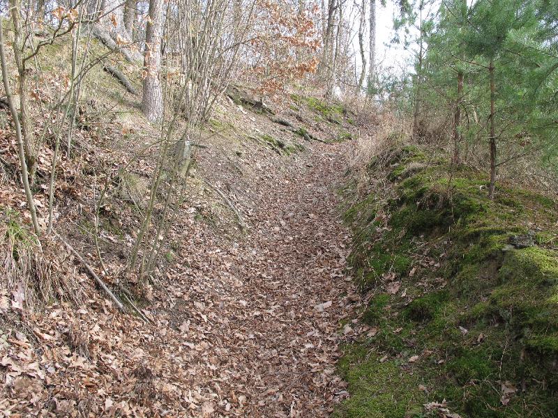 Příkop oddělující tvrz od stoupající planiny