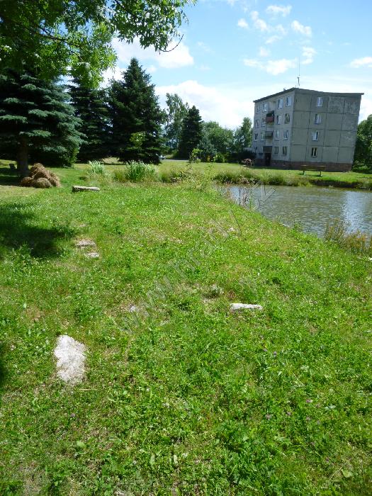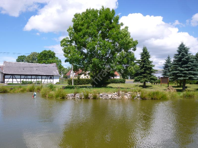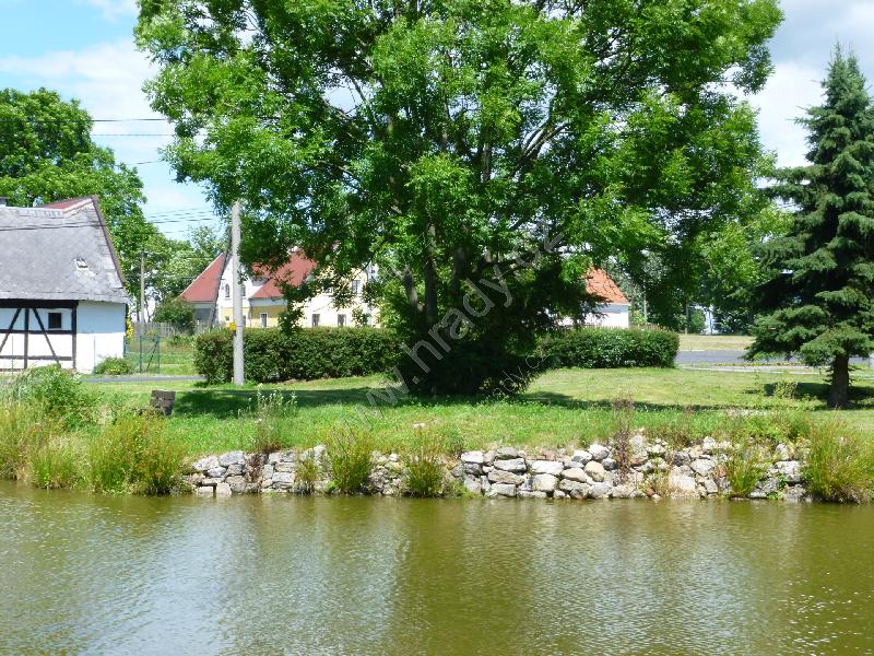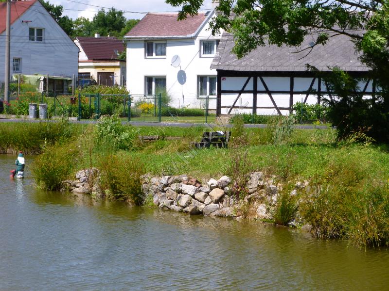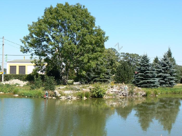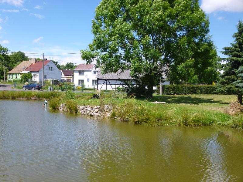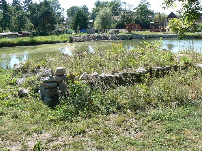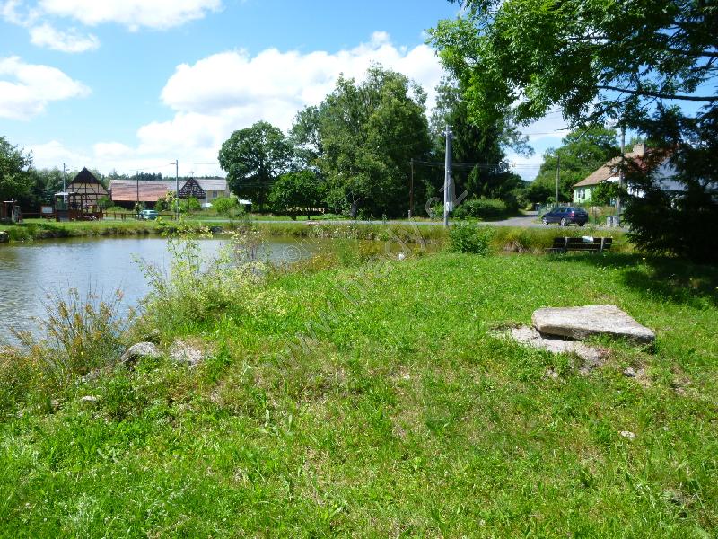 Celkový pohled na tvrziště přes rybník