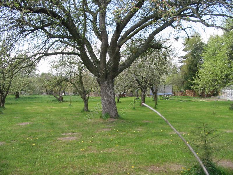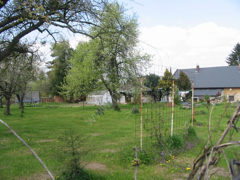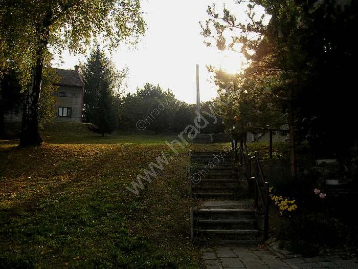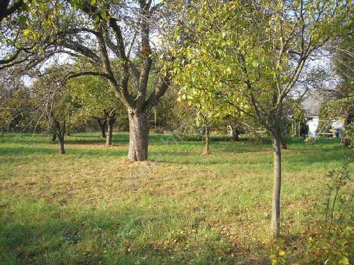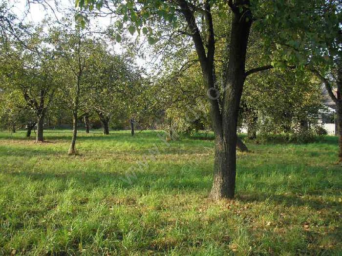 pohled na stoupající pozemek se sadem, na kterém snad stávala tvrz