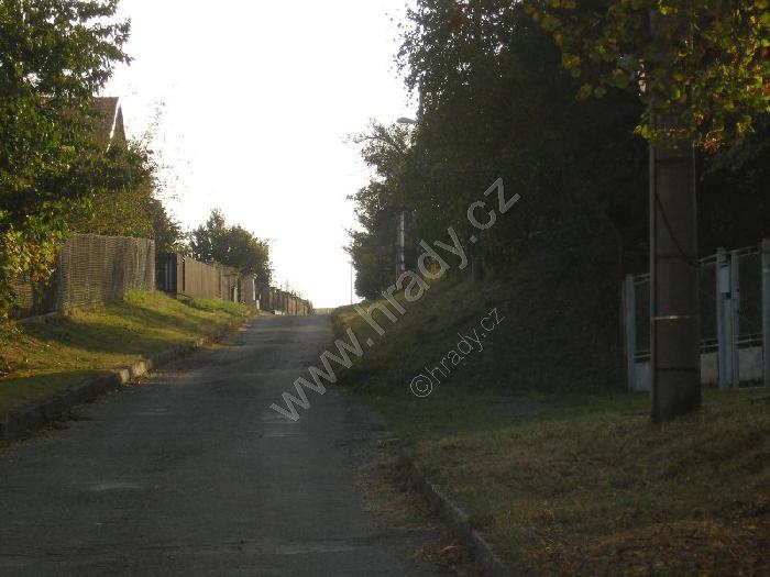 ulice Na pustých, vpravo zvedající se pozemek se sadem a snad i místo tvrze