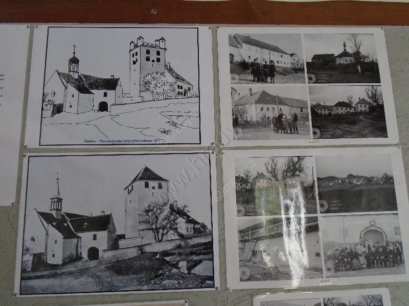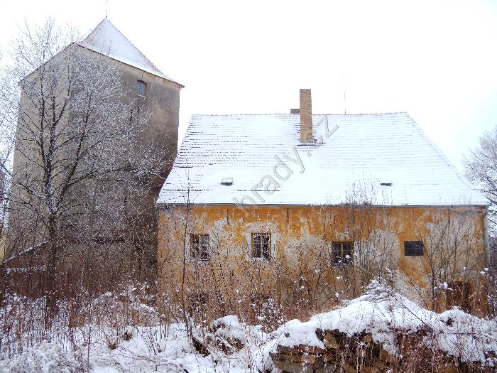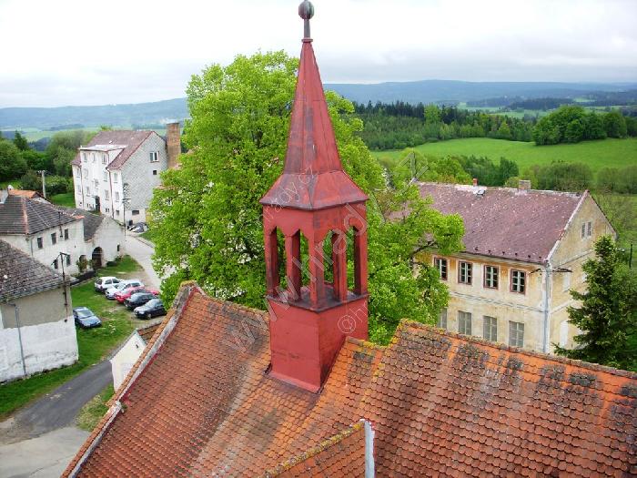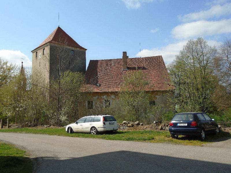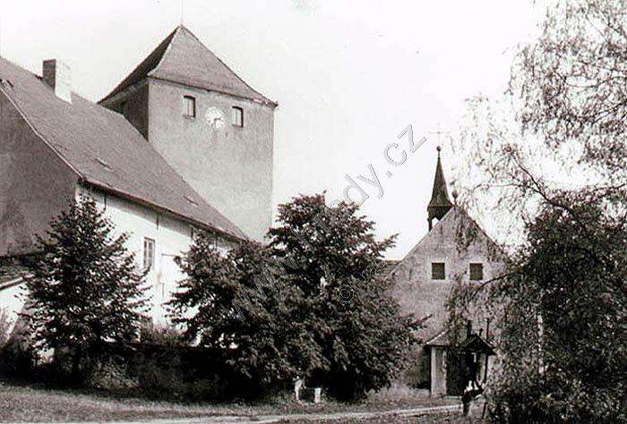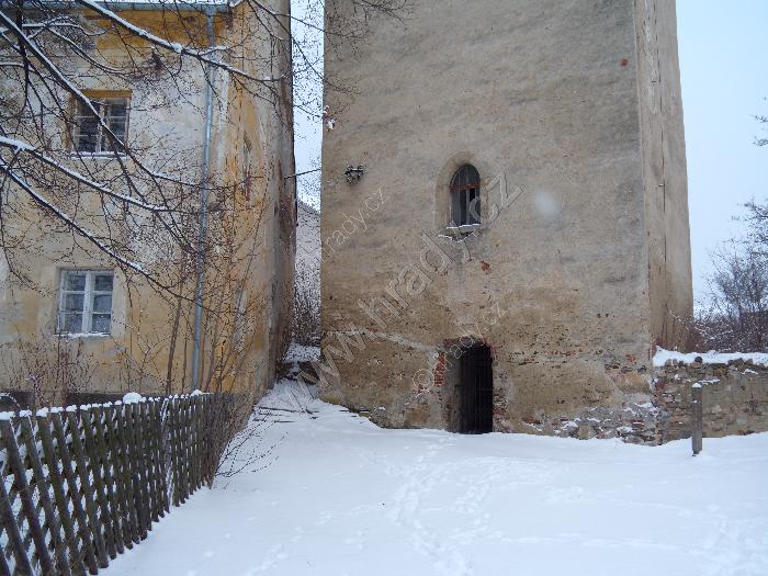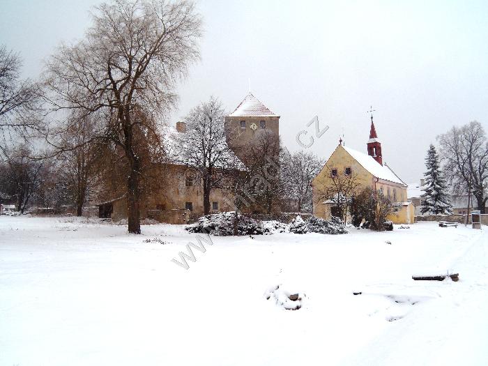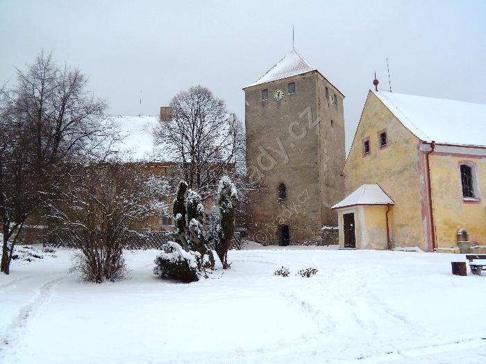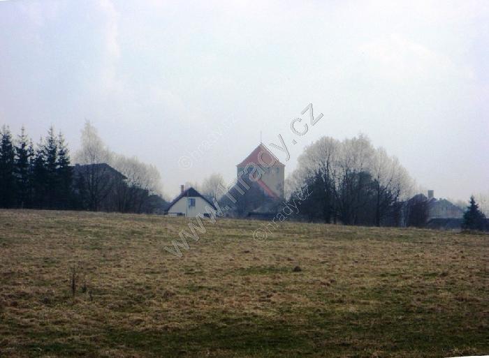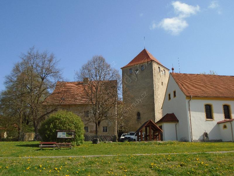 pohled na tvrz z východu, vlevo kostel sv. Bartoloměje