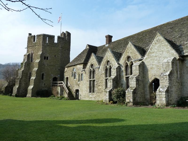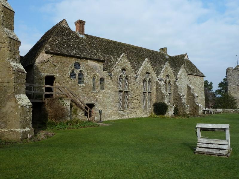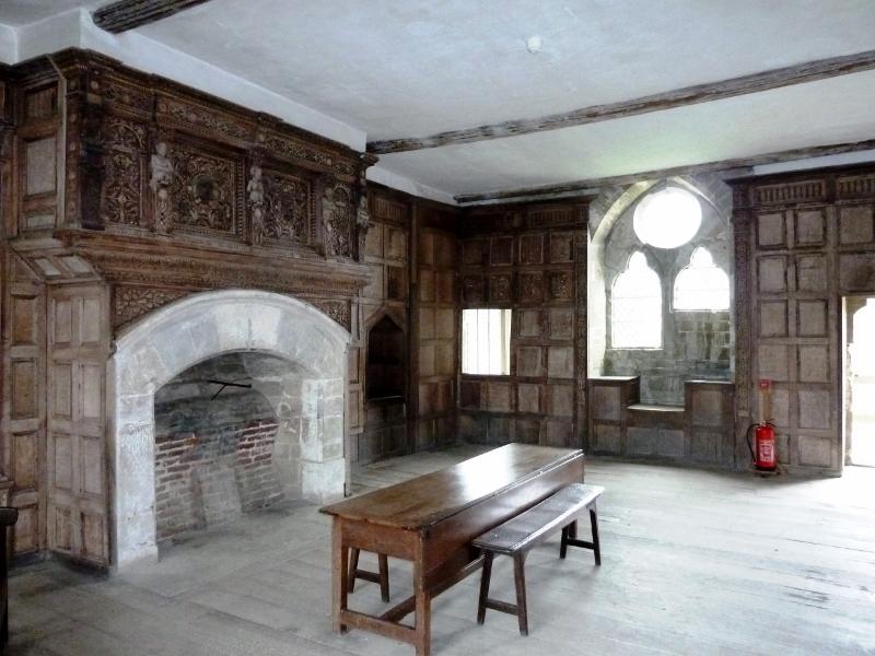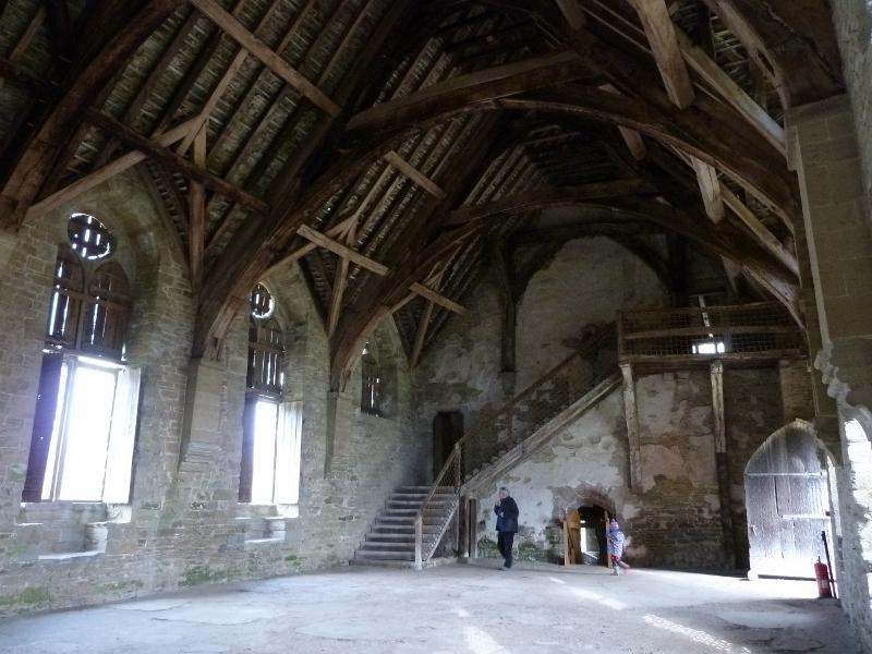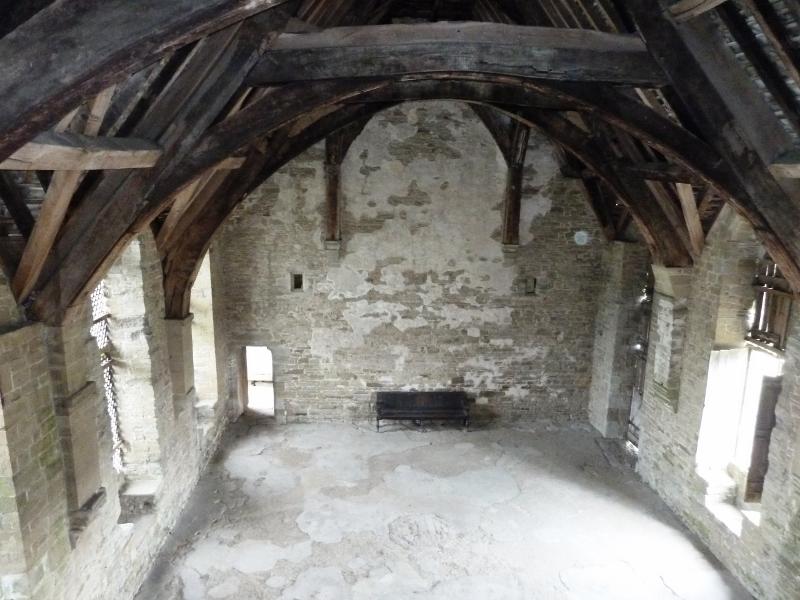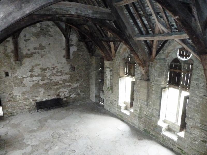 Severní část velkého sálu se schodištěm do severní věže. Stáří většiny dřeva schodiště a střechy je 700 let.