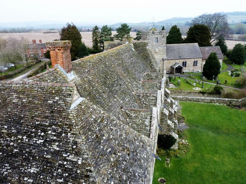 Pohled z ochozu jižní věže na střechu paláce a velkého sálu. Na pozadí je kostel sv. Jana Křtitele.