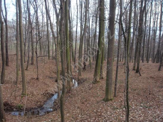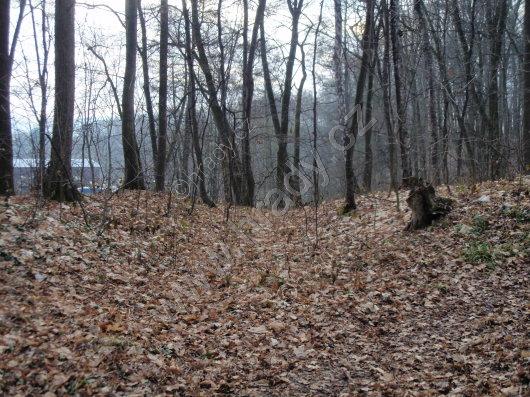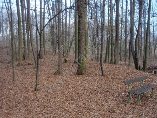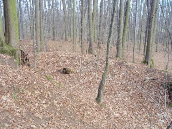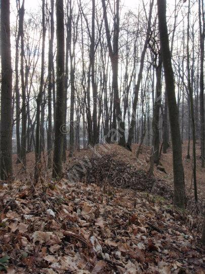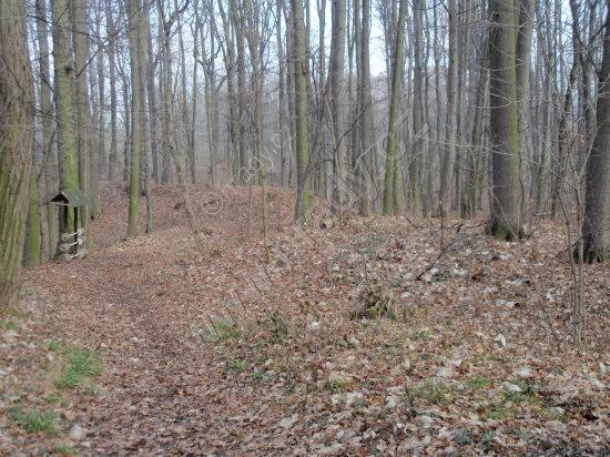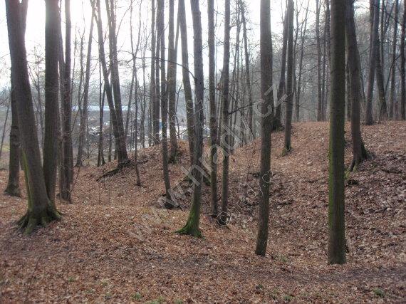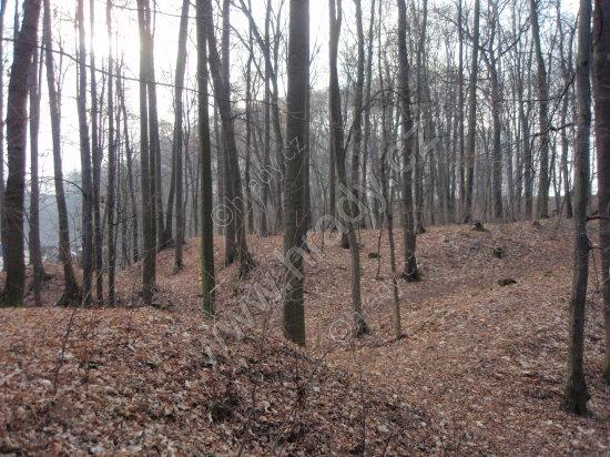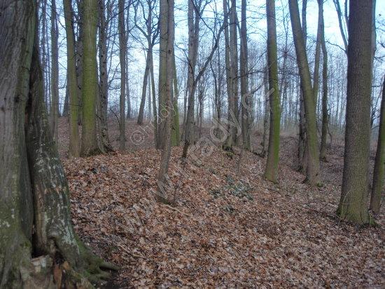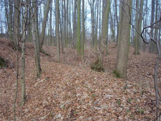 prostor mezi dolním a horním rybničním valem, vzadu patrný dolní rybniční val - pravděpodobná součást opevnění tvrze