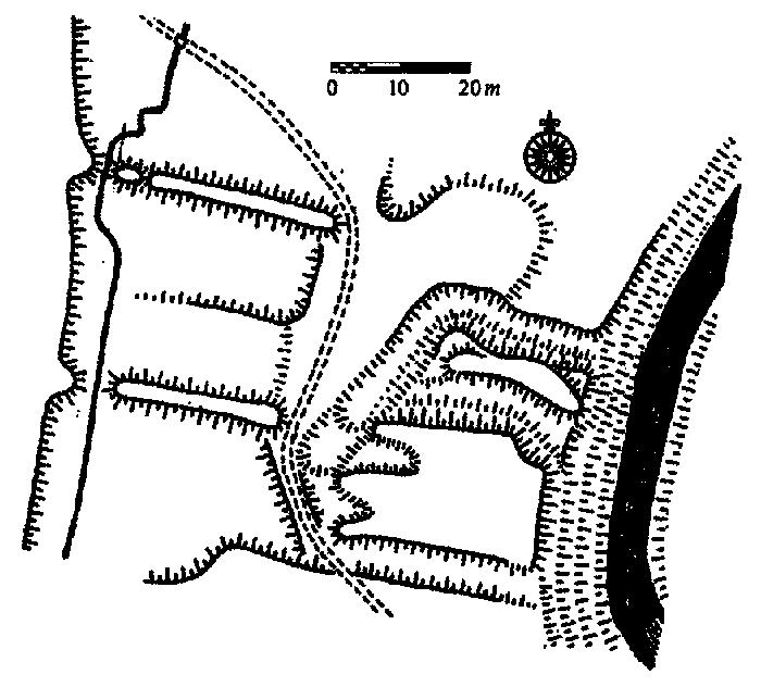 jádro tvrze při svahu nad řekou, v popředí patrný jižní příkop