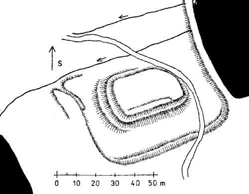 Terénní vlna, která rozděluje pole jižněji od tvze a nivu potoka, kde stávala tvrz.