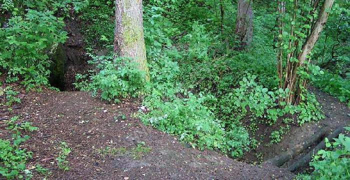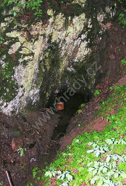 K tomuto místu dojdete po zelené značce od Spáleného Poříčí. Vlevo skála se vstupem do šachty.