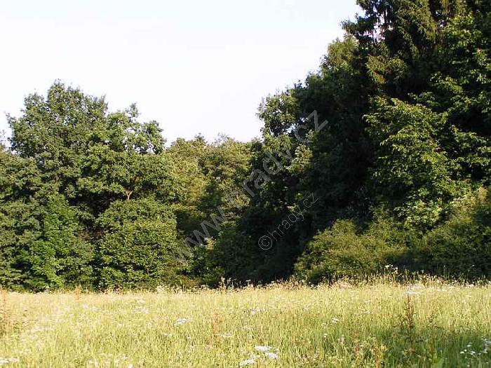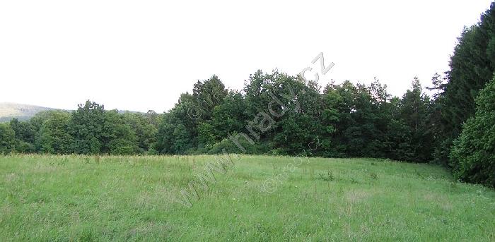 jihovýchodní cíp louky s tvrzištěm - skála se šachtou je při samém pravém okraji fotografie (za křovím)