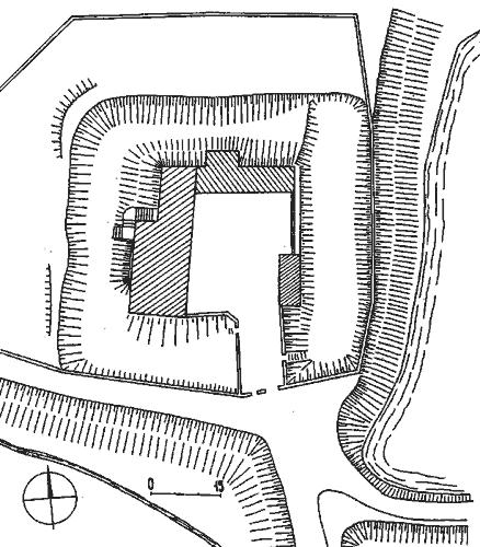 Jádro se stavbou je vyvýšené, pod ním severozápadní zaoblení příkopu