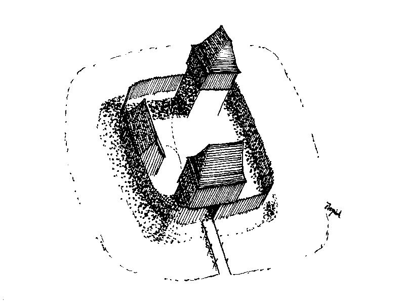 pohled od kostela na centrální pahorek tvrze (žlutá věžovitá stavba)
